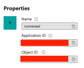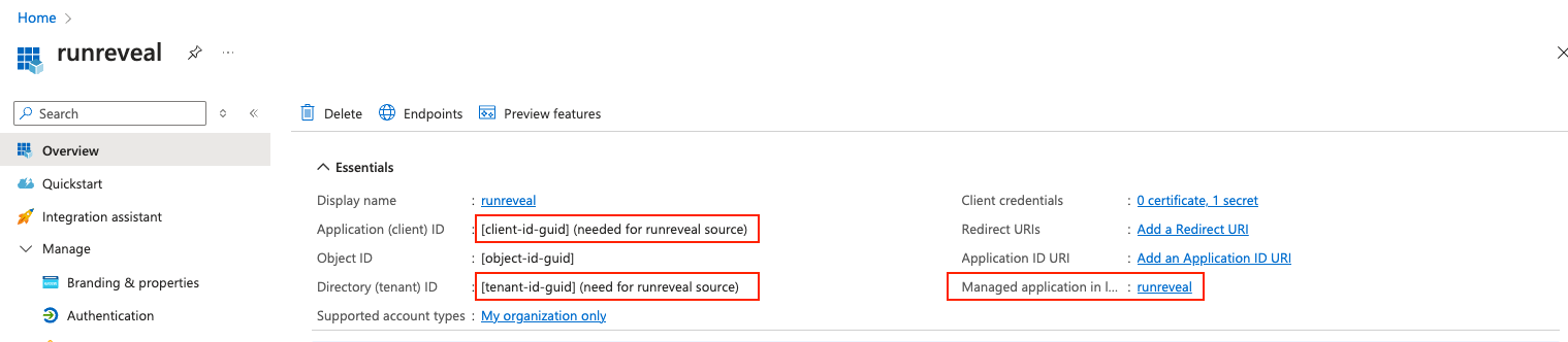 You should now be presented with the details of the new app. Copy and save the Application (client) ID and the Directory (tenant) ID as these will be needed when setting up a RunReveal source.