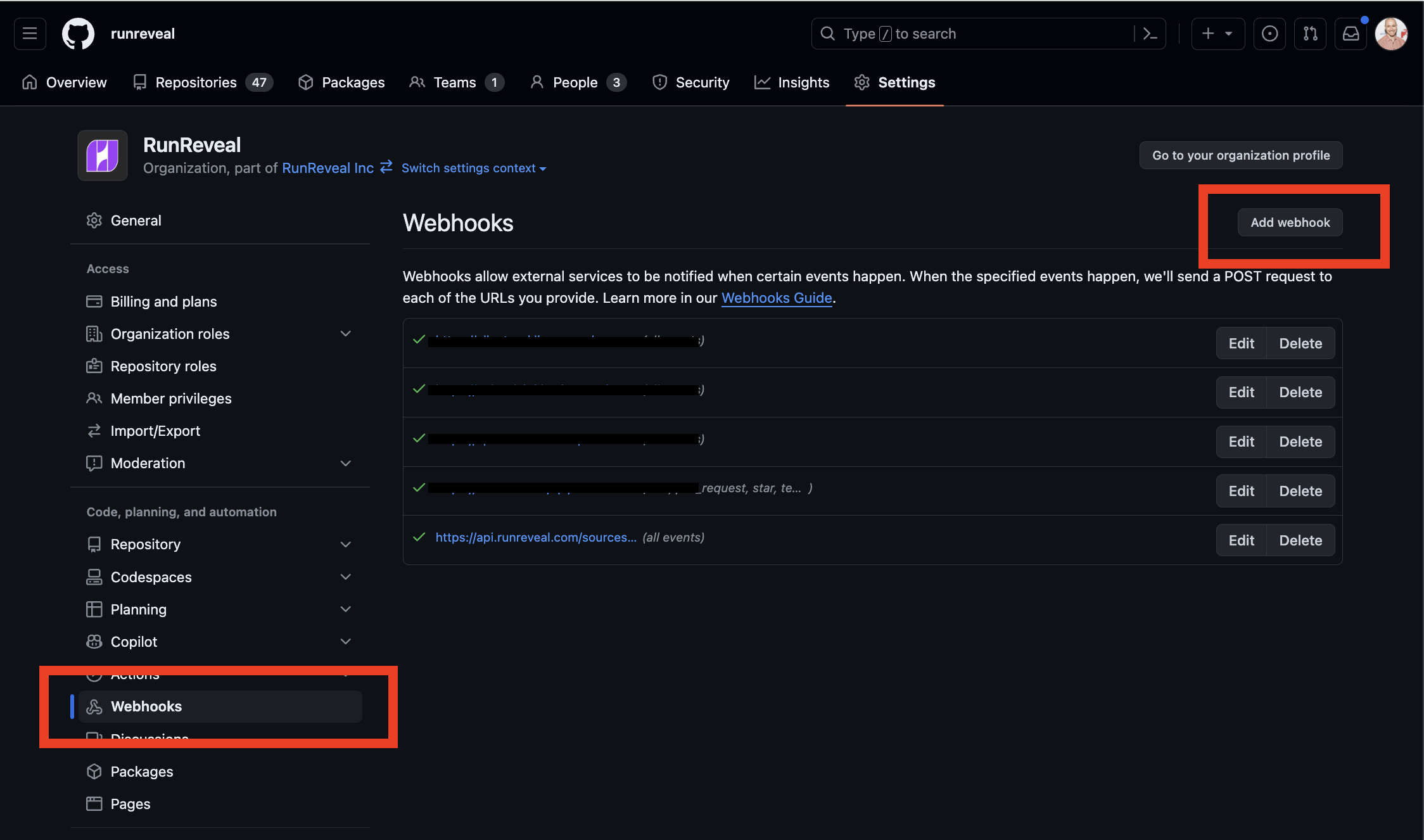 This source uses am HTTP webhook to ingest events. Create the Github Webhook source in RunReveal and a new webhook URL will be generated. Use this URL when setting up your source.