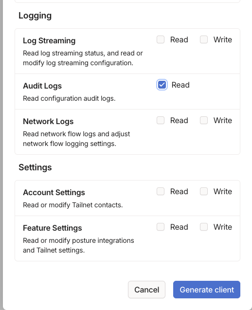 To set up the Tailscale integration, you need to create an OAuth client in your Tailnet settings. For detailed instructions, see the Tailscale OAuth client documentation.