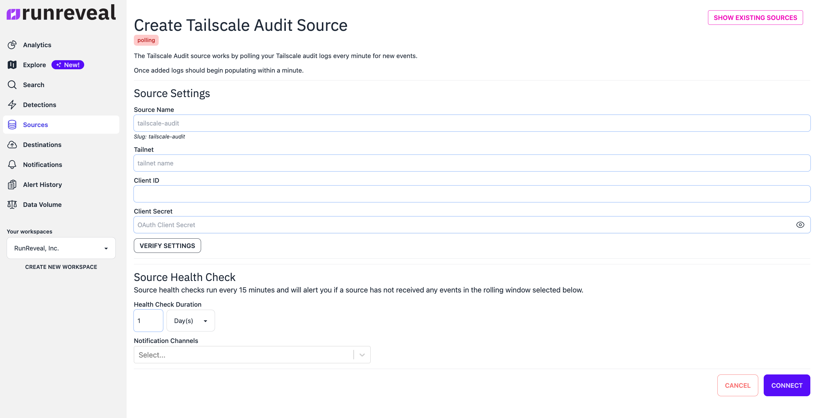 RunReveal will begin collecting your Tailscale logs immediately and backfill the last 30 days of audit logs.